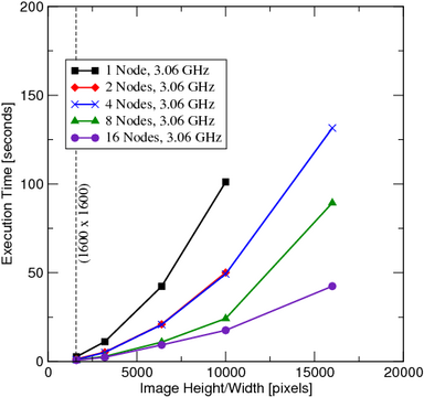 секунд. Даже изображение 16,000 x 16,000 пикселей, 16 узлов,