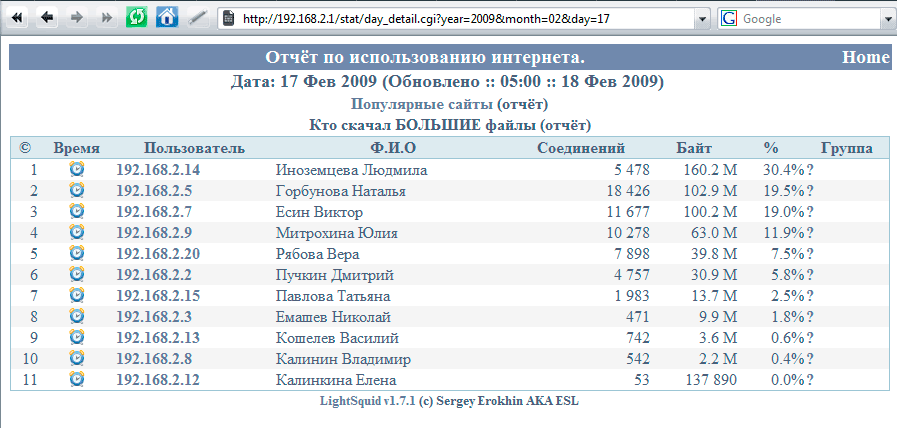 Вот в принципе и все. Шлюз настроен, трафик считается, начальство