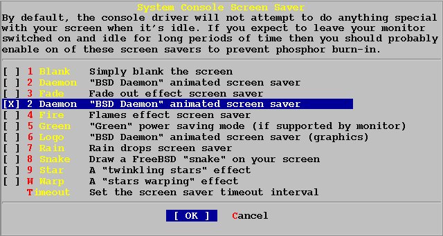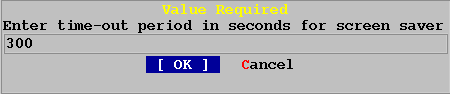 По умолчанию, время отображения заставки 300 секунд. Чтобы изменить этот интервал, выбирите "Timeout" и нажмите SPACE. Появится следующее меню: