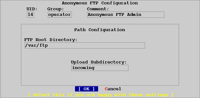 Чтобы разрешить анонимный FTP доступ, выбирите [Yes] и нажмите ENTER. После чего у вас появится экран подобный следующему: