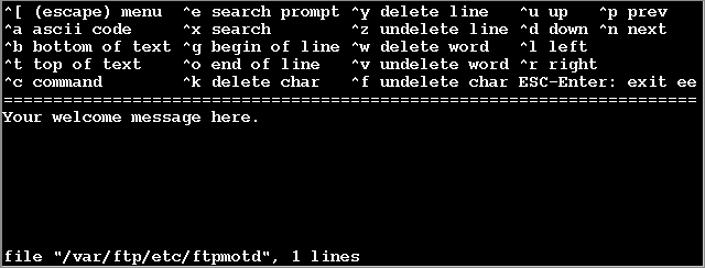 Этот редактор называется "ee". Используйте его встроенные подсказки по командам редактирования или отложите создание сообщения, и воспользуйтесь удобным вам редактором чтобы создать его позже. Запомните имя и путь файла приветствия, оно будет показано в нижней части экрана.