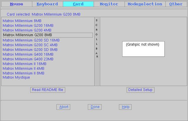 С помощью прокрутки (scrollbar) выбирите из списка соответствующую видео карту. Щелкните по выбранной карте и появится надпись "Card selected:" сверху над списком.