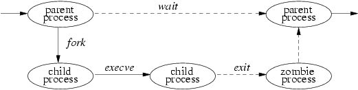 The process lifecycle is depicted in Figure 2-1. A process may create a new process that is a copy of the original by using the fork system call. The fork call returns twice: once in the parent process, where the return value is the process identifier of the child, and once in the child process, where the return value is 0. The parent-child relationship induces a hierarchical structure on the set of processes in the system. The new process shares all its parent's resources, such as file descriptors, signal-handling status, and memory layout.