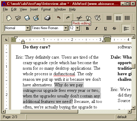 AbiWord is one of several GPL WYSIWYG word processor projects; this one has produced a very nice word processor based on an XML format. It is capable of Word file import. AbiWord is still a work in progress, although it is useful for small things now.