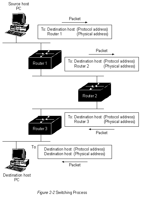 Алгоритмы коммутации сравнительно просты и в основном одинаковы для большинства протоколов маршрутизации. В большинстве случаев главная вычислительная машина определяет необходимость отправки пакета в другую главную вычислительную машину. Получив определенным способом адрес роутера, главная вычислительная машина-источник отправляет пакет, адресованный специально в физический адрес роутера (уровень МАС), однако с адресом протокола (сетевой уровень) главной вычислительной машины пункта назначения.
