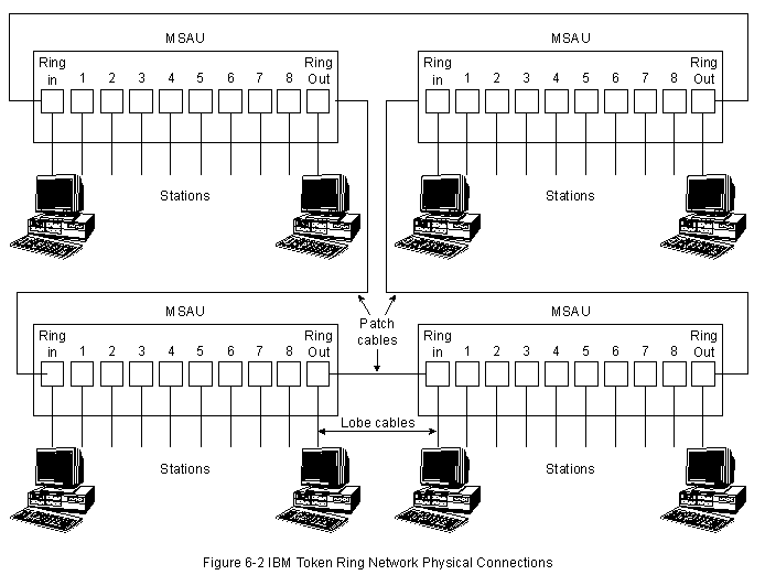 Станции сети IBM Token Ring напрямую подключаются к MSAU, которые могут быть об'единены с помощью кабелей, образуя одну большую кольцевую сеть (смотри Рис. 6-2). Кабели- перемычки соединяют MSAU со смежными MSAU. Кабели-лепестки подключают MSAU к станциям. В составе МSAU имеются шунтирующие реле для исключения станций из кольца.