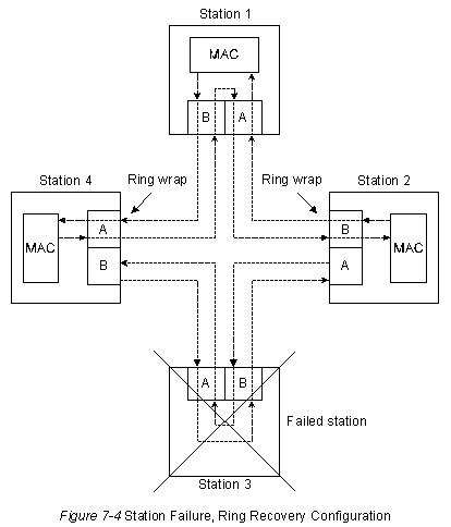 На Рис. 7-5 "Конфигурация восстановления сети при отказе кабеля" показано, как FDDI компенсирует отказ в проводке. Станции 3 и 4 свертывают кольцо внутрь себя при отказе проводки между этими станциями.