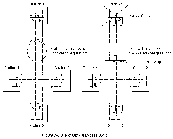 Для предотвращения сегментации кольца могут быть использованы оптические шунтирующие переключатели, которые исключают отказавшие станции из кольца. На Рис. 7-6 показано "Использование оптического шунтирующего переключателя".