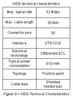 HSSI определяет как электрический, так и и физический интерфейсы DTE/DCE. Следовательно, он соответствует физическому уровню эталонной модели OSI. Технические характеристики HSSI обобщены на Рис. 9-1.