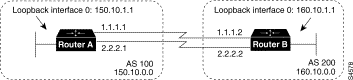 !Router A interface loopback 0 ip address 150.10.1.1 255.255.255.0 ! router bgp 100 neighbor 160.10.1.1 remote-as 200 neighbor 160.10.1.1 ebgp-multihop neighbor 160.10.1.1 update-source loopback 0 network 150.10.0.0 ! ip route 160.10.0.0 255.255.0.0 1.1.1.2 ip route 160.10.0.0 255.255.0.0 2.2.2.2