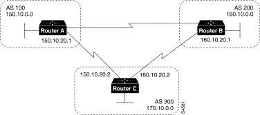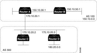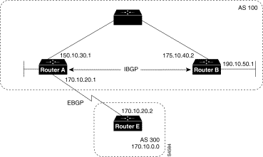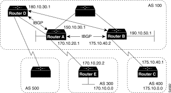 !Router A router bgp 100 neighbor 180.10.30.1 remote-as 100 neighbor 190.10.50.1 remote-as 100 neighbor 170.10.20.2 remote-as 300 network 150.10.0.0 !Router B router bgp 100 neighbor 150.10.30.1 remote-as 100 neighbor 175.10.40.1 remote-as 400 neighbor 180.10.30.1 remote-as 100 network 190.10.50.0 !Router C router bgp 400 neighbor 175.10.40.2 remote-as 100 network 175.10.0.0 !Router D router bgp 100 neighbor 150.10.30.1 remote-as 100 neighbor 190.10.50.1 remote as 100 network 190.10.0.0