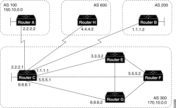 ! Router D router bgp 300 neighbor 192.208.10.2 remote-as 200