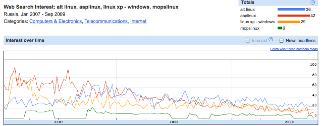 Рис. 3. Сравнение частоты российских поисковых запросов по ALT Linux, ASPLinux, Linux XP и MOPSLinux
