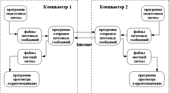 Электронная почта во многом похожа на обычную почтовую службу. Корреспонденция подготавливается пользователем на своем рабочем месте либо программой подготовки почты, либо просто обычным текстовым редактором. Обычно программа подготовки почты вызывает текстовый редактор, который пользователь предпочитает всем остальным программам этого типа. Затем пользователь должен вызвать программу отправки почты (программа подготовки почты вызывает программу отправки автоматически). Стандартной программой отправки является программа sendmail. Sendmail работает как почтовый курьер, который доставляет обычную почту в отделение связи для дальнейшей рассылки. В Unix-системах программа sendmail сама является отделением связи. Она сортирует почту и рассылает ее адресатам. Для пользователей персональных компьютеров, имеющих почтовые ящики на своих машинах и работающих с почтовыми серверами через коммутируемые телефонные линии, могут потребоваться дополнительные действия. Так, например, пользователи почтовой службы Relcom должны запускать программу UUPC, которая осуществляет доставку почты на почтовый сервер.