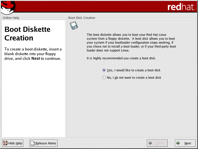 Очень рекомендуется загрузочную дискету создать. Если система не сможет правильно загрузиться при помощи GRUB, LILO или другого загрузчика, загрузочная дискета поможет это сделать.
