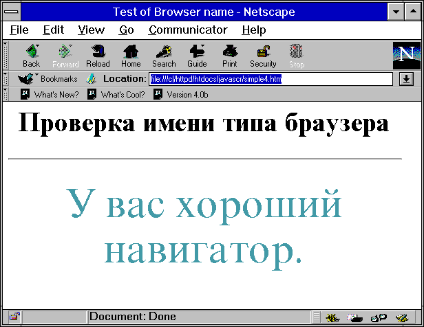 В данном примере текст JаvaScript-программы размещен непосредственно в теле документа. При его загрузке, когда HTML-интерпретатор доходит до контейнера SCRIPT, вызывается JavaScript-интерпретатор. В этот момент будет проверяться условие, которое содержится в операторе if. В зависимости от результата проверки этого условия остальной текст страницы примет тот или иной вид в зависимости от типа программы просмотра. При просмотре данного документа программой отличной от Netscape Navigator будет выдано еще и окно предупреждения.