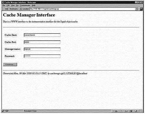 Если вы настраивали файл "squid.conf", то используйте парольную аутентификацию для доступа к "cachemgr.cgi", вам будет предложено ввести имя кэша (Cache Host), порт кэша (Cache Port), имя администратора (Manager name) и пароль (Password) перед тем, как допустят к программе "cachemgr.cgi". Смотрите конфигурационный файл "/etc/squid/squid.conf", приведенный выше, для большей информации.