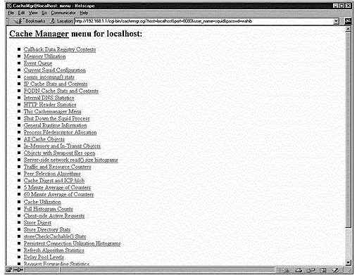 Утилита cachemgr.cgi, доступная по умолчанию, когда вы скомпилировали и инсталлировали Squid на вашей системе, создана для запуска через веб интерфейс, и выводит различную статистику о конфигурации и работе Squid. Эта программа располагается в каталоге "/usr/lib/squid", и вы должны переместить ее в ваш каталог "cgi-bin" (например, /home/httpd/cgi-bin). Следующие шаги помогут вам настроить программу для использования.