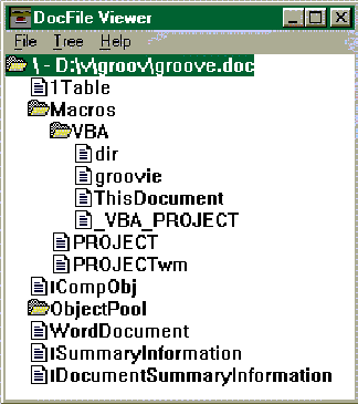 Вот вам пример. Microsoft Word для документов Windows, версии 7 и старше, использует разновидность BASIC, называемую Visual Basic for Applications (VBA). Все объекты, хранимые в этом типе файлов, имеют каталогоподобную структуру, включая текст и выполняемый код (см. рисунок 2). В нашем примере непосредственно сам текст сохранен в объекте с именем "WordDocument", а вирус содержится в "каталоге" \Macros\VBA\, в объекте "groove". Остальные объекты содержат данные, необходимые для использования в служебных целях в Windows и Word.