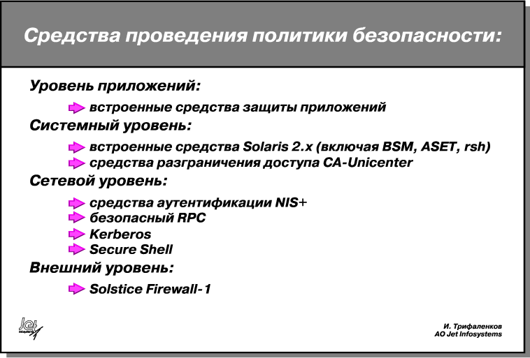 В то же время, CA-Unicenter не является панацеей от всех бед. В частности, серьезным недостатком оказывается отсутствие средств защиты от перехвата пакетов в сети при работе процедур telnet, rlogin. В этом случае как имеющиеся в ОС Solaris собственные средства обеспечения безопасности при работе в сети с распределенными ресурсами (такие как NIS+, SecureRPC), так и независимые разработки (семейство программных продуктов класса Kerberos) эффективно дополняют службу безопасности, построенную на основе CA-Unicenter.