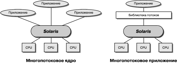 Solaris поддерживает симметричные многопроцессорные системы Sun. Ядро операционной системы является полностью многопотоковым, поэтому при выполнении системных функций используются все преимущества MP/MT, что улучшает общую производительность. Даже на однопроцессорных системах достигается выигрыш от многопотоковой реализации Solaris, благодаря более эффективному переключению между задачами (см. Рис. 3 ).