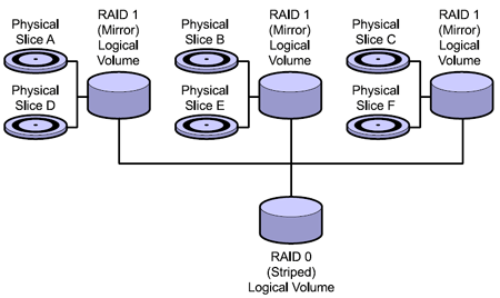 Как видно на следующем рисунке, RAID-1+0 представляет собой совокупность зеркальных томов, объединенных в ╚распределенное╩ логическое устройство: