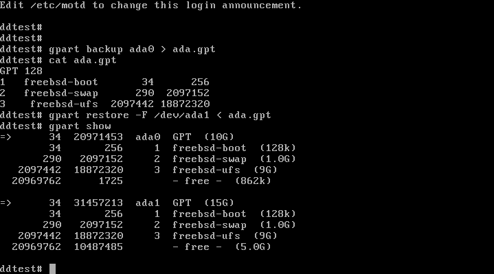 ># gpart restore -F /dev/ada1 < ada0.gpt