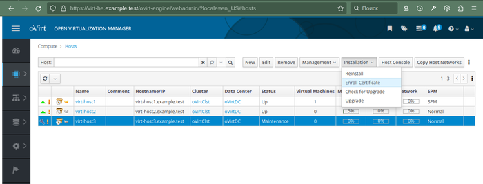Добрый день. Спасибо за инструкцию, она может помочь в критической ситуации. Добавлю свои 5 коп. Чтобы сертификат хоста, сделанный таким образом, не отвалился через полчаса по subject alternative, надо добавить в него extensions, например, добавив в конец /etc/pki/hosted-engine/openssl.conf примерно следующее: